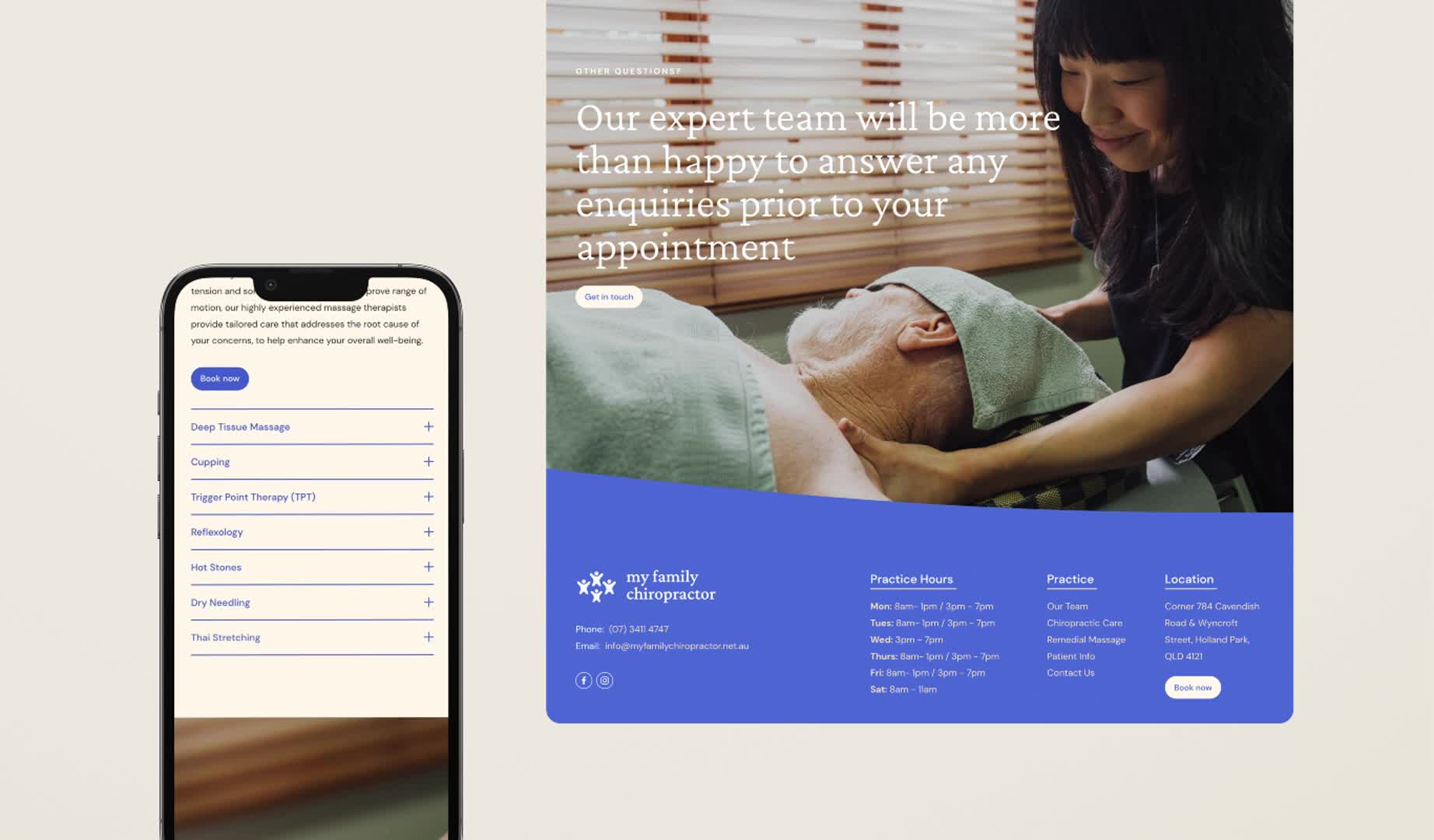 My Family Chiropractor are a longstanding practice based in Brisbane, providing holistic chiropractic and massage services since 1981. Known for their commitment to supporting patients’ bodies and nervous systems, the practice has become a trusted place for families seeking comprehensive healthcare. Dedicated to caring for entire families, from newborn babies to the elderly, My Family Chiropractor has extensive experience and a strong foothold in the community. Looking to enhance their digital presence, the practice reached out to us for a re-design of their website.